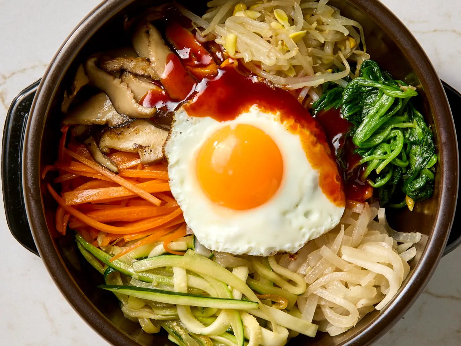 Bibimbap là món cơm trộn đầy màu sắc gồm cơm trắng, các loại rau củ xào, thịt bò thái lát mỏng, trứng ốp la và tương ớt Gochujang đặc trưng. Mỗi khẩu phần như một bức tranh với màu sắc bắt mắt từ rau, củ xanh, đỏ và vàng, khiến người ăn vừa thưởng thức vừa ngắm nhìn thú vị. Hương vị đậm đà từ tương ớt pha lẫn vị giòn của rau và mềm thơm của cơm tạo nên trải nghiệm ăn uống khó quên.