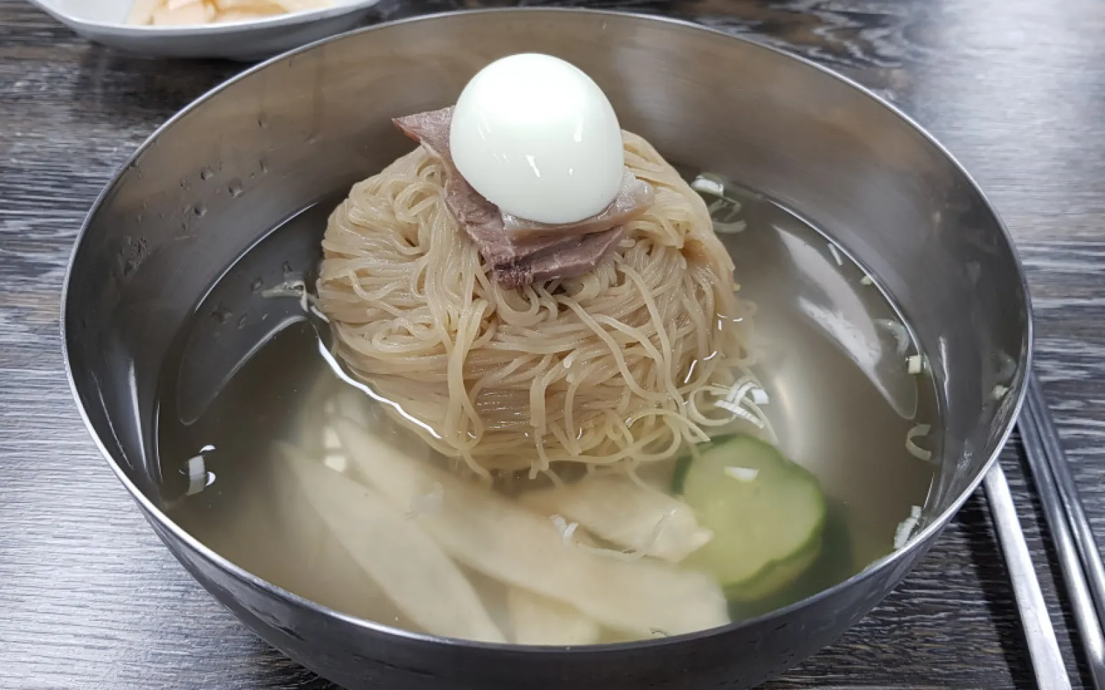 Naengmyeon là món mì sợi lạnh làm từ khoai lang hoặc kiều mạch, ăn cùng nước dùng lạnh, lát dưa chuột, trứng luộc và thịt bò thái mỏng. Đây là món giải nhiệt rất được người Hàn ưa chuộng vào mùa hè, nổi bật với vị thanh mát, chua dịu và thơm ngon.