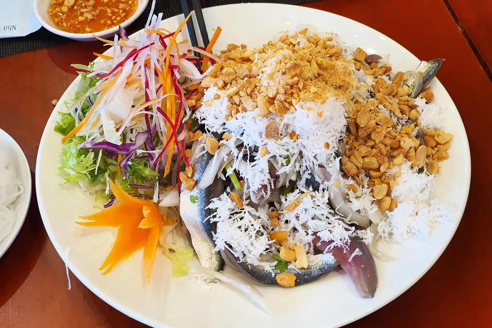 Gỏi cá trích: Cá trích tươi sống được phi lê mỏng, cuốn cùng rau thơm, dưa leo, khế chua và bánh tráng mỏng, chấm mắm nêm cay nồng. Món này ăn kèm đậu phộng rang giòn, chỉ 100.000đ/phần tại các quán ven biển Bãi Trường – vừa mát lạnh vừa kích thích vị giác.
