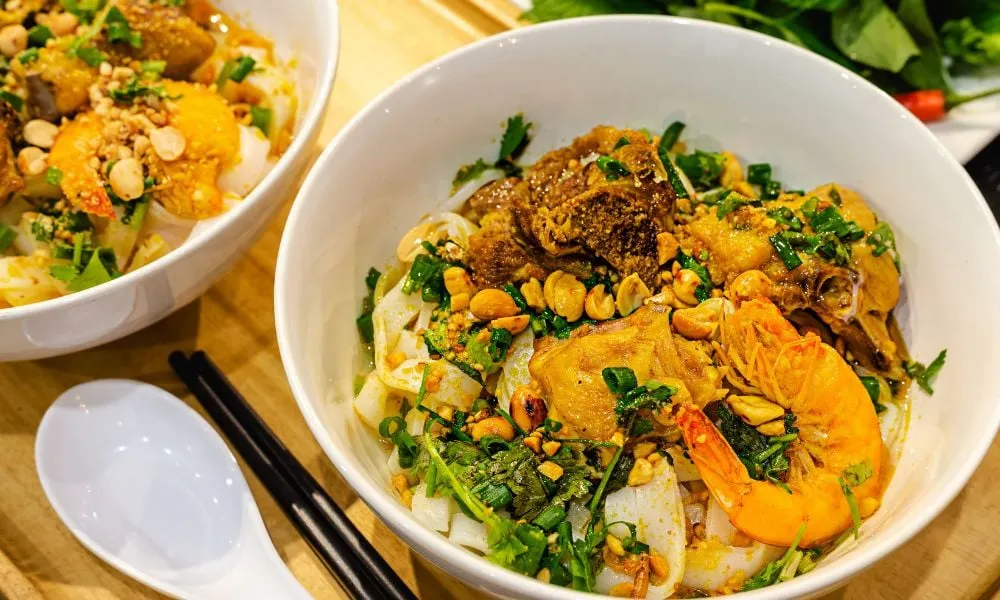 Mì Quảng là món ăn đặc trưng với sợi mì dày, thơm, nước dùng đậm đà nấu từ tôm, gà hoặc cá lóc. Khi ăn kèm bánh tráng mè, rau sống và đậu phộng rang, món ăn trở nên đầy đặn và rất “đã miệng”. Mì Quảng Đà Nẵng có nét riêng so với Hội An hay Quảng Nam, khiến du khách dễ bị chinh phục ngay từ lần đầu thưởng thức.
